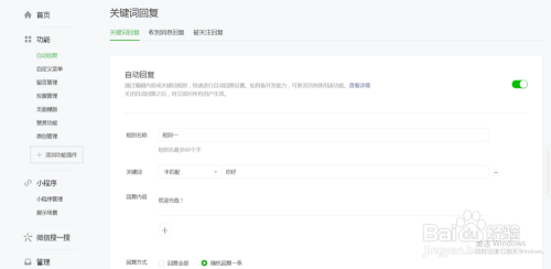 点击第一个“关头词答复”,我们可以设置一些关头词,当接收到的用户动静中包含有设置的关头词时就会主动答复对应的动静。如下图所示