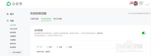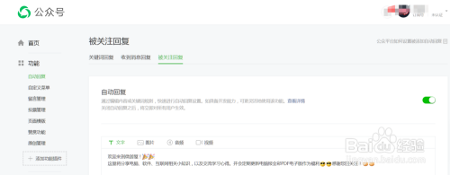点击第三个“被存眷答复”,我们可以设置当用户存眷公家号第一次进入公家号界面时答复的内容。如下图所示
