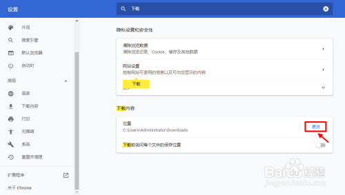5、在设置列表的搜索框中输入关头词“下载”,点击“更改”选项亦可。