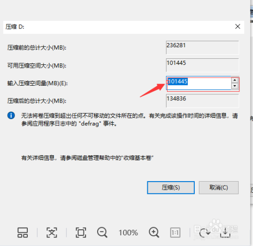 打开“压缩卷”后,找到“输入压缩空间量”,选摘要压缩的空间。