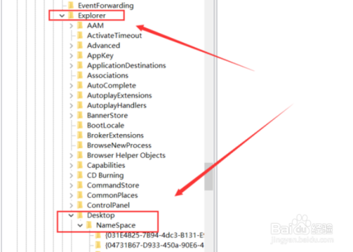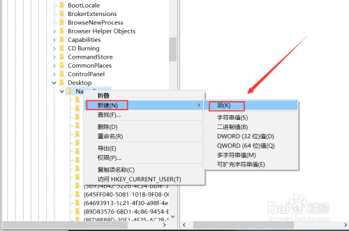 “Explorer”-“DeskTop”-“NameSpace”项,图所示,右击”NameSpace“选择“新建”-“项”。