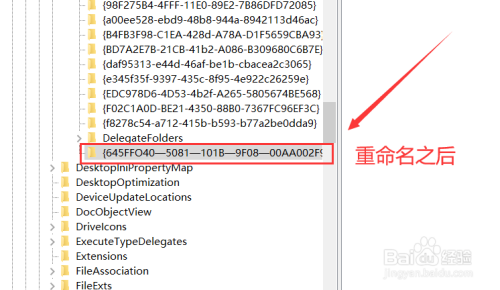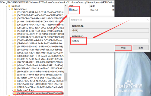 待“新建项”创完当作后,将其进行“重定名”操作,重定名为“{645FFO40—5081—101B—9F08—00AA002F954E}”(不包含双引号),然后右击右侧的“默认”键值,将其数设置为“收受接管站”。
