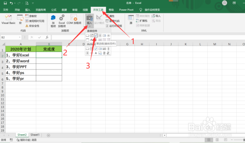 第三步:在【开辟东西】选项卡下方找到【插入】,点击【复选框(窗体节制)】