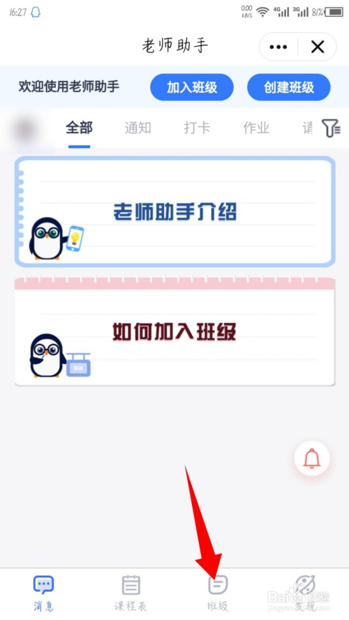 打开教员助手小程序后,点击底部的班级选项。如图所示