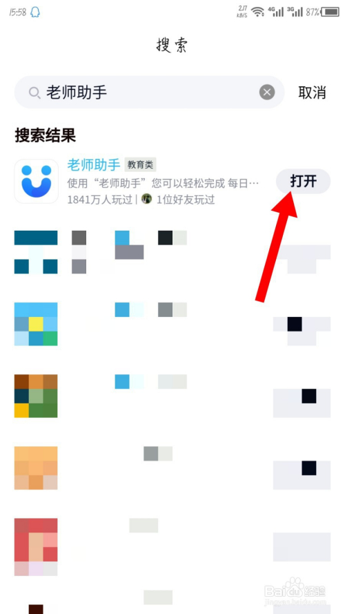 输入后就能看到搜刮成果了,点击教员助手后面的打开。如图所示