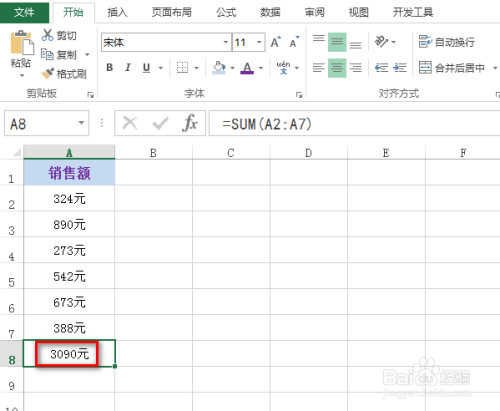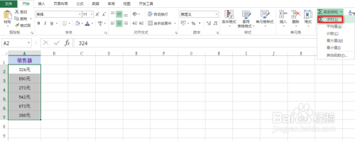 可以看到所有的数值都有了单元元,接着,在“起头”选项卡下找到并点击“主动乞降”,并选择“乞降”,具体如下图所示: