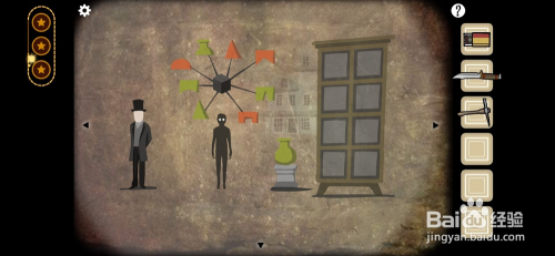 退到小狗处,点击墙上的圆形敞亮处,进入一个小游戏。通关体例参照我的图片。