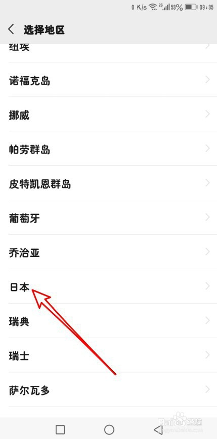 5、然后在打开的选择地域的页面中选择日本的设置项。