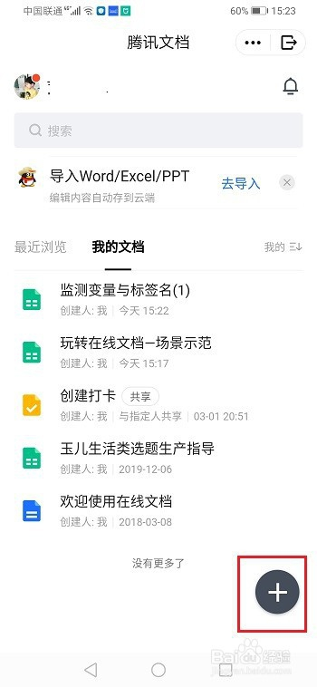 第二步进去腾讯文档之后,点击+号图标,如下图所示: