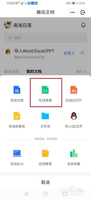 第三步点击+号图标之后,可以新建在线文档,在线表格等,这里选择新建在线表格,如下图所示: