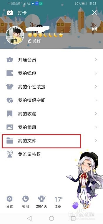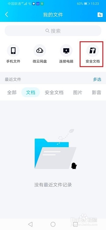 第一步手机上打开qq侧边栏,点击我的文件,选择平安文档,如下图所示: