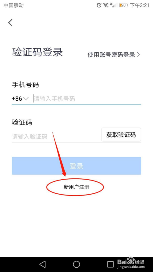 在新用户注册页面,输入手机号码,点击“获取验证码”,然后输入手机短信收到的验证码,点击“注册”按钮。