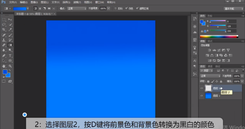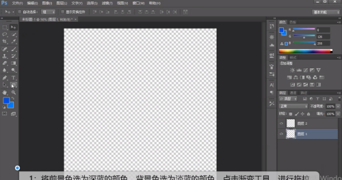 - 11.将前景色选为深蓝的颜色,布景色选为淡蓝的颜色,点击渐变东西,进行拖沓。