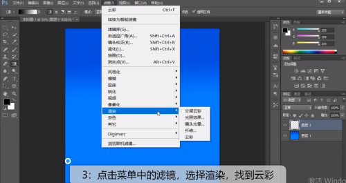 - 33.点击菜单中的滤镜,选择衬着,找到云彩。