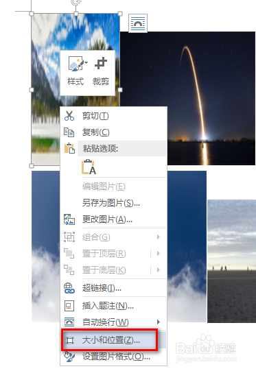 首先,选中此中一张图片,鼠标右键,在呈现的下拉菜单中,点击“大小和位置”,具体如图所示: