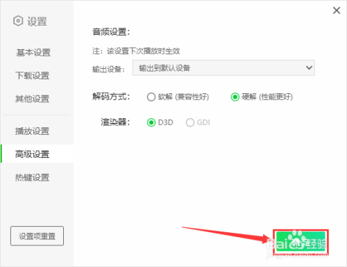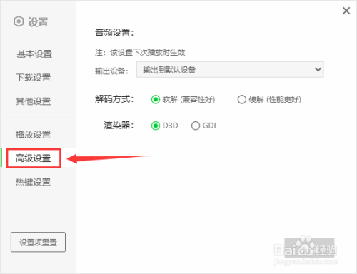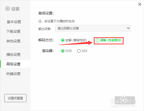 进入“高级设置”页面在“解码体例”右侧,点击“硬解(机能更好)”使其前面圆圈中有一个实心的小圆点即可。见下图