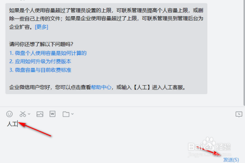 5.在输入框里,输入【人工】两个字,点击【发送】按钮。