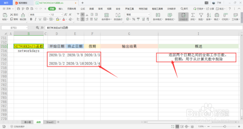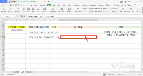 选中一个单位格用于存放输出成果,在菜单栏的公式下,打开日期和时候下拉框,点击此中的NETWORKDAYS函数。
