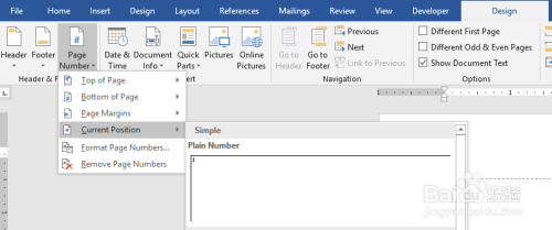 在“ 页眉和页脚东西设计”选项卡中,打开“ 页码”菜单,然后从“ 当前位置”选项中选择“ 纯数字 ” 。这将在光标的当前位置插入页码。