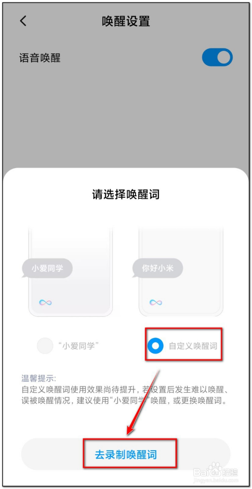 选择“自界说叫醒词”---->“去录制叫醒词”