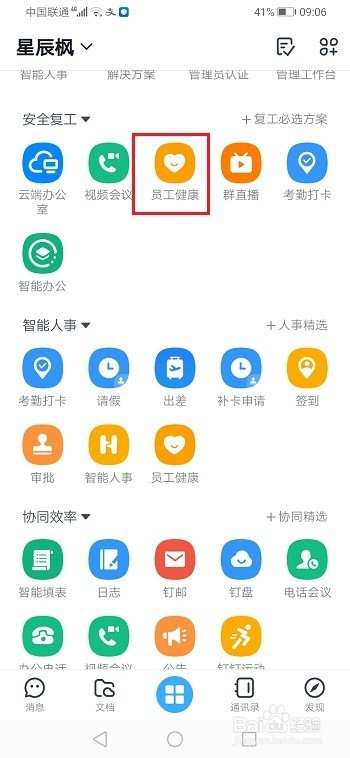 第一步手机上打开钉钉,进去工作界面,点击员工健康,如下图所示:
