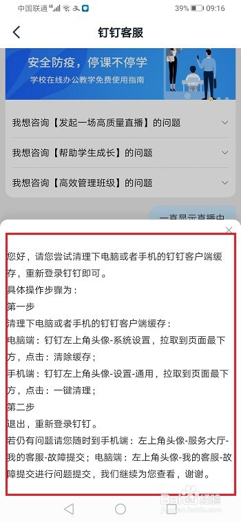 第五步进去之后,点击一键清理,清理缓存之后,从头打开钉钉,就不会一向显示直播中了,如下图所示: