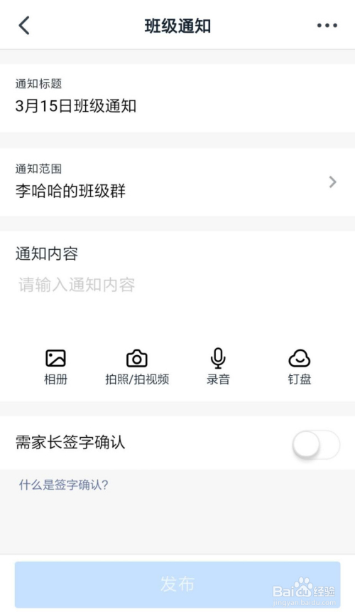 7、选择后进入通知编纂界面,按提醒选择相关设置,然后点击底部的“发布”即可
