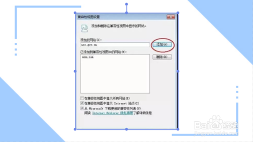 系统打开如下图所示的兼容性视图设置,点击添加按钮即可把当先网站添加到兼容性视图模式: