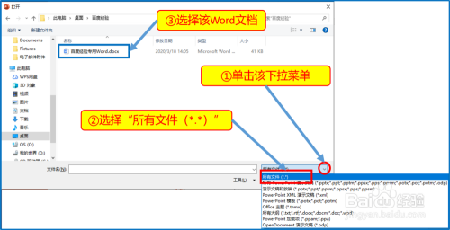 弹出文件选择窗口,此时还不克不及选择Word文档,点开右下角的下拉菜单,选择“所有格局(*.*)”,然后在选择指定的Word文档,选中后点右下角处的“打开”按钮。