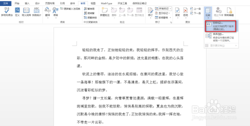 在“核阅”选项卡下找到并点击“比力”,并选择“比力文档的2个版本”,具体如图所示: