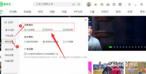 以爱奇艺为例,当该软件被安装今后,您的电脑今后就会弹出各类告白窗口了,不信的话咱们就进入爱奇艺的设置里看看,在“其他设置”里就有较着的告白提醒。