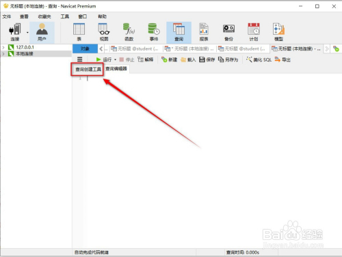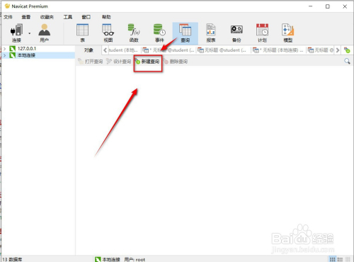 第一步,打开我们的Navicat Premium本家儿界面,如下图,在界面顶部中找到“查询”,如下图