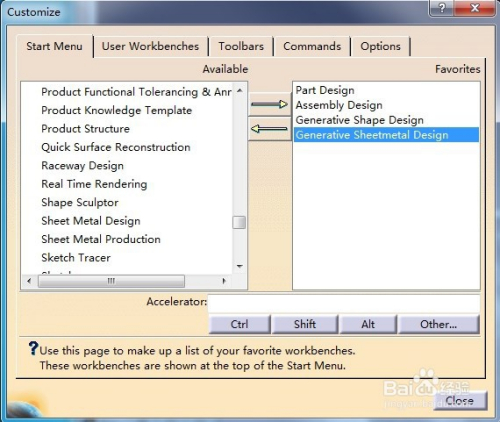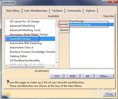 之后进入到自界说页面,也就是“Customize”页面,选择“Start Menu”选项,也就是开始菜单,好比会经常用到零件设计(Part Design),那就选中“Part Design”,然后点击旁边偏向标的目的右的箭头“->”。