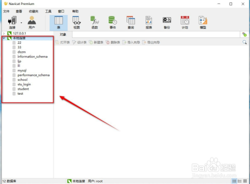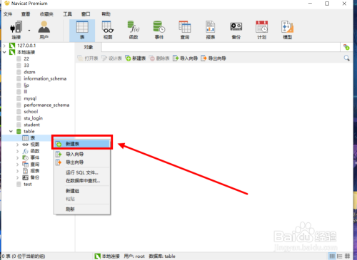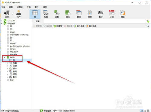 第四步,在当地毗连中找到我们方才建立的table数据库,如下图,table列表中找到“表”的功能,,如下图