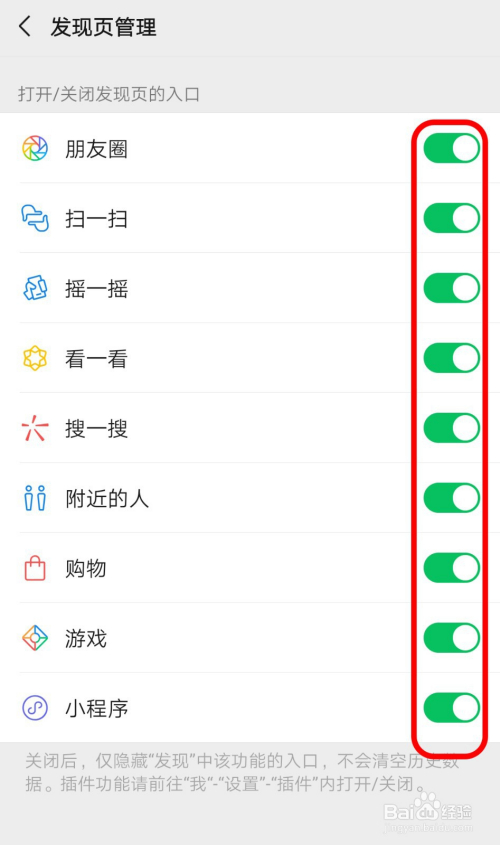 打开后,点击右边的“开关按钮”可以开启/封闭发现页的进口。