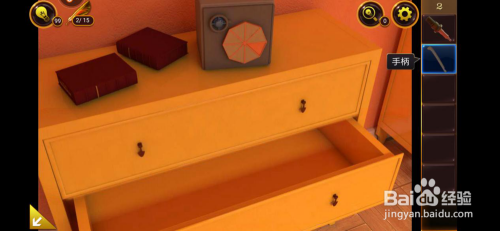 打开柜子下面的抽屉,将抽屉里面的手柄拾取起来。