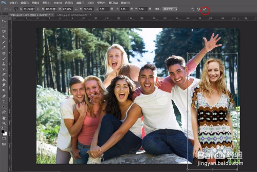 第五步:按快捷键Ctrl+T键,调整人物的大小以顺应合影图片,调整完当作后单击“√”按钮。