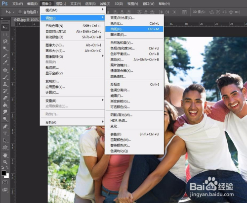 第六步:选中人物图层,选择菜单栏中的“图像--调整--曲线”。