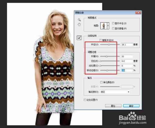 第三步:如下图所示,在调整边缘对话框中,按照抠图边缘的转变环境调整半径、光滑、移动边缘等滑块,使边缘加倍天然,调整完当作后,单击“确定”按钮。