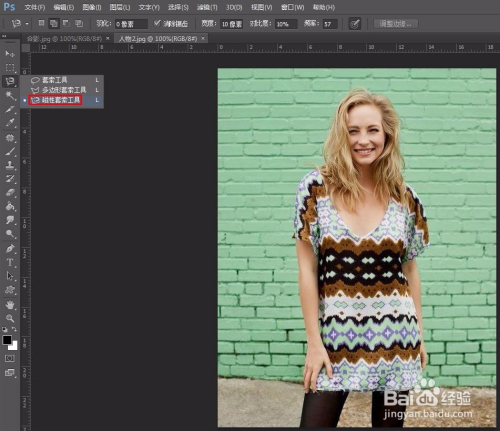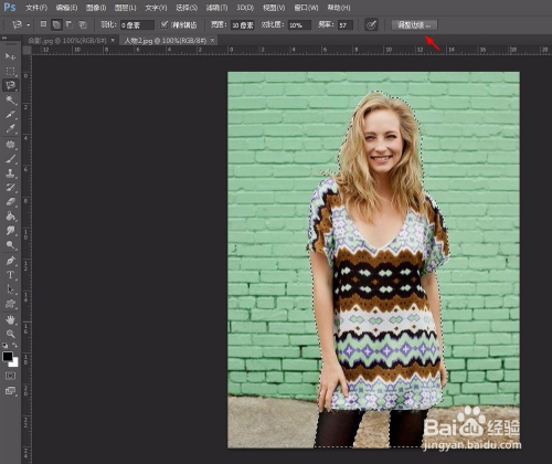 第二步:用磁性套索东西选中人物选区,并单击上方的“调整边缘”按钮。