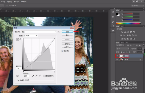 第七步:在弹出的“曲线”调整框中,调节曲线使人物的色和谐合影一致。