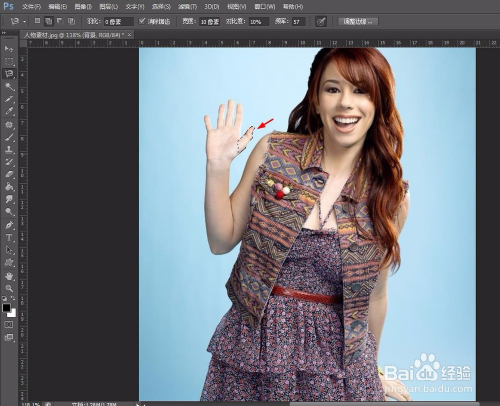 第七步:选中人物照片图层,按住Alt键同时滚动鼠标滑轮,将图片放大,用磁性套索东西选中大拇指区域,按Ctrl+J键复制选区。