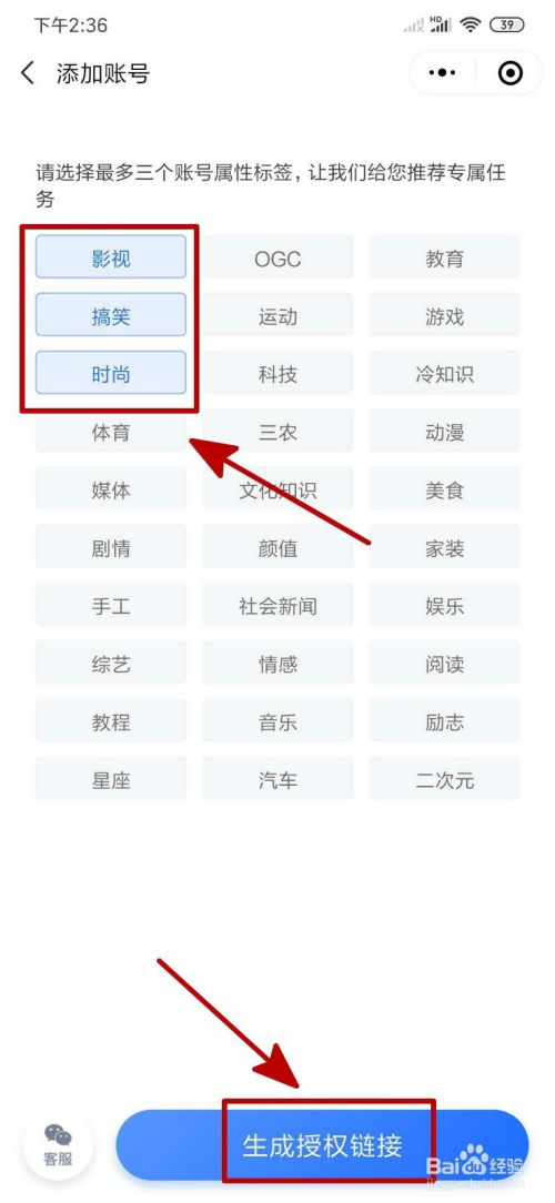 选择1-3个账号的【属性标签】,然后点击【生当作授权链接】