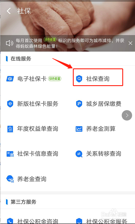 5.经由过程授权和身份验证后,就进入了社保查询页面,可以选择"养老保险","医疗保险","掉业保险"三种进行查询;