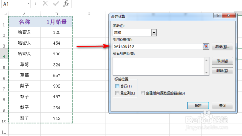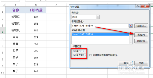 接着,点击“添加”,将“引用位置”的内容添加到“所有引用位置”,并勾选“首行”与“最左列”,最后点击“确定”,具体如图所示: