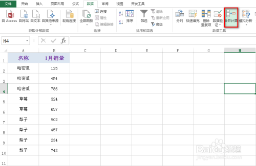 在“数据”选项卡下找到并点击“归并计较”,具体如图所示: