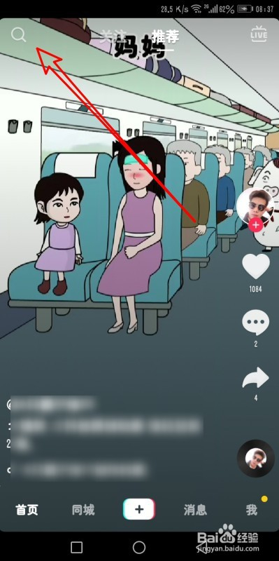 2、在打开的抖音软件本家儿界面点击左上角的“搜刮”按钮。