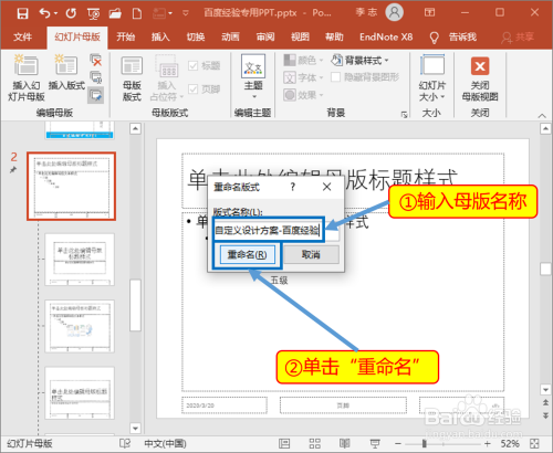 输入母版名称,单击“重定名”。