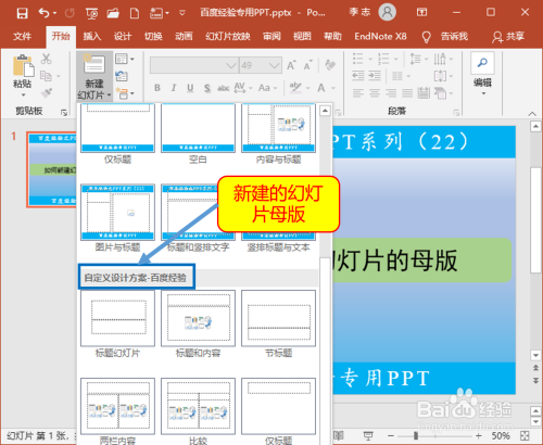 在“新建幻灯片”下拉菜单中有一个新的母版以及相对应的默认版式。