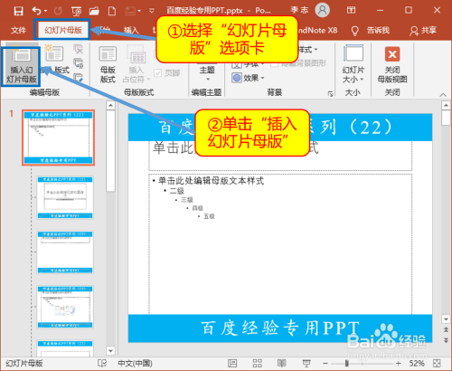 在“幻灯片母版”选项卡中单击“插入幻灯片母版”。